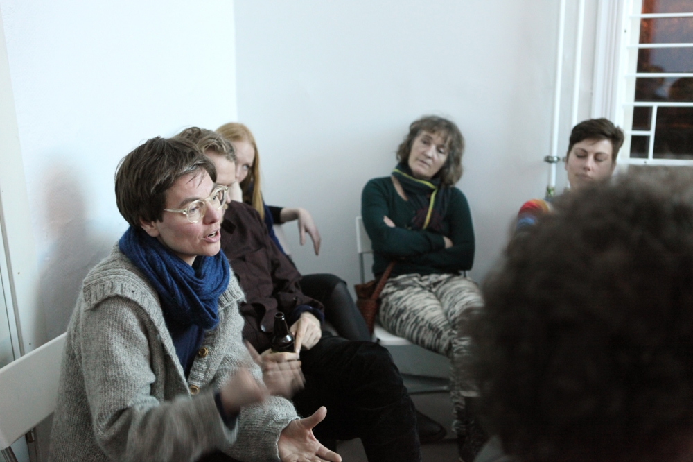As everyone sat down again we opened up for the participants to discuss their own experiences and what they thought was lacking in the art scene. Attending the discussion was artists and curators from Norway and thanks to Tenthaus Oslo´s large network we had a great turnout. This informal round-table discussion lead to an interesting dialog concerning history writing, media attention and the fear of becoming victimized as a woman artist. The talk went from formulating the problems, concerning the writing of history, the inclusion and exclusion from art history and the importance of re-writing such history, to institutional selection and the current situation in Norway, to finding solutions and strategies to challenge the current order through quotas, using the word ‘feminism’ and the importance of create networks for women artist. The idea of networks was a reoccurring notion and seems to be something that is lacking for women artists in their career, suggestions were made for us to start a facebook group and/or find other ways to establish a common ground for women to help each other and address concerns. The evolving discussion manifested how important it is to find a place in art history for women and to establish platforms where we can discuss and help one another along in an art world where we don’t get included. This round-table discussion was very rewarding as everyone shared ideas and opinions, which will be great help in our forthcoming research since it also gave us a hint of what the artists themselves lack.